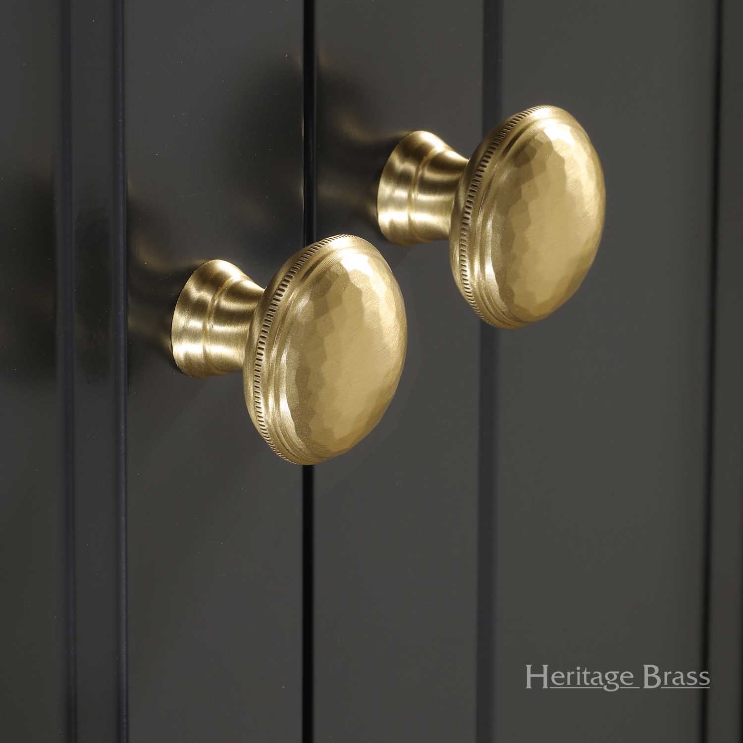 An intricate handmade cabinet knob with a serrated edge all the way around. The hand-beaten brass catches the light at varying angles and enhances the unique beauty of the cabinet knob.