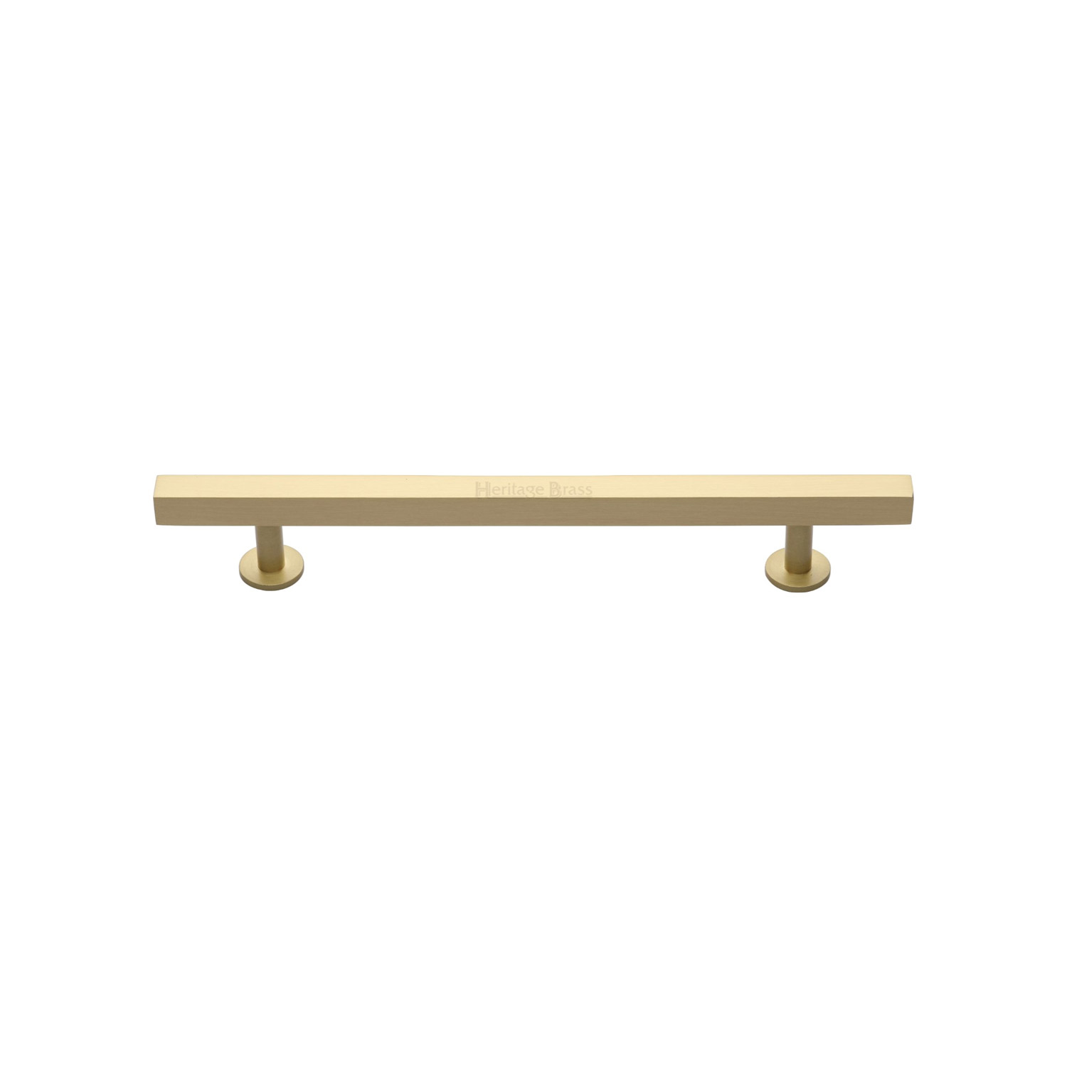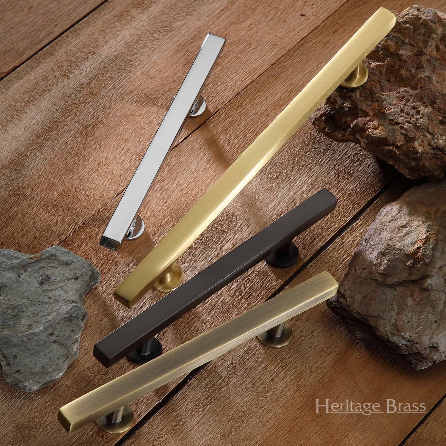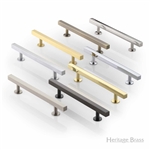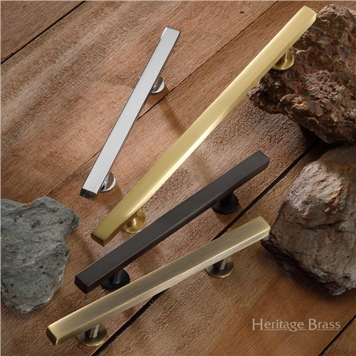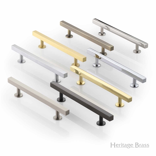 A square shaped cabinet handle with footings. A simple design with symmetry and straight lines that lends itself to any décor.