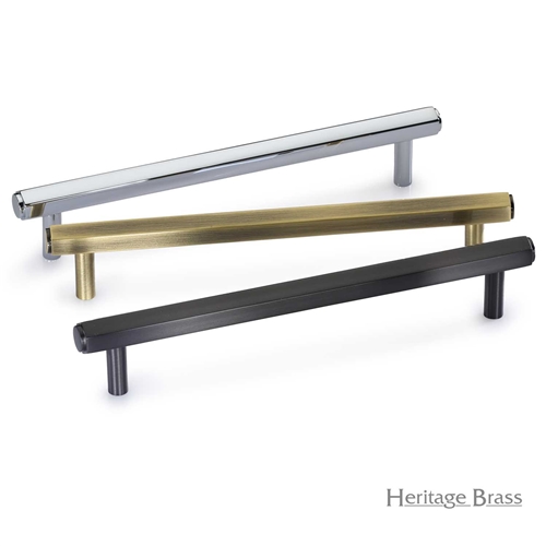 A modern hexagonal shaped cabinet pull handle which mirrors the design principles of the art deco movement of geometric shapes and straight lines.